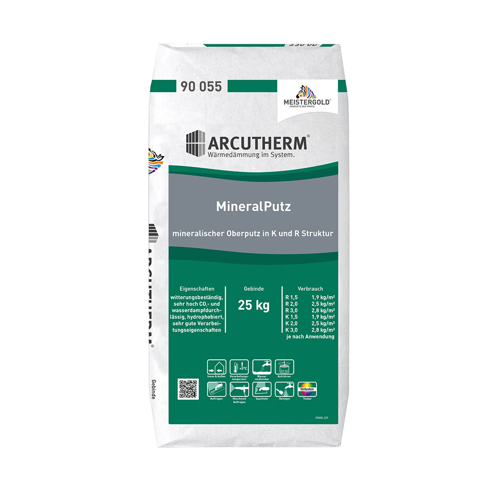 ARCUTHERM MineralPutz als mineralischer Oberputz mit Kratzputzcharakter oder Rillenstruktur für innen und außen. Sehr gut geeignet für mineralische Armierungsmassen. Werktrockenmörtel nach DIN. Sackware.