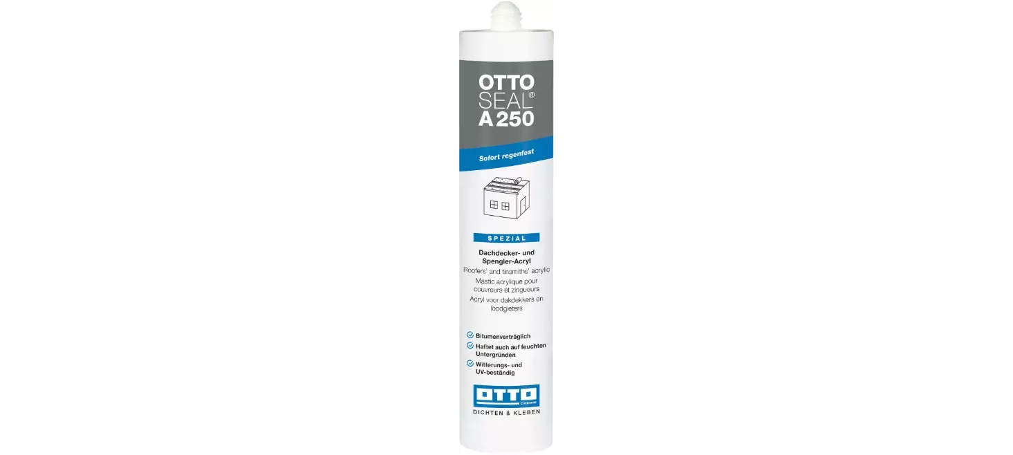Das Dachdecker- und Spengler-Acryl OTTOSEAL A 250 eignet sich hervorragend zum Abdichten von jeglichen Fugen und Nähten im Dachbereich, sowie die Randabdichtung an Schornsteinen. Der Dichtstoff ist sofort regenfest, bitumenverträglich und haftet auch auf feuchten Untergründen. Zusätzlich bildet er eine Absperrung bitumenhaltiger Baustoffe zu nachfolgenden Dichtstoffen (z.B. aus Silikon).